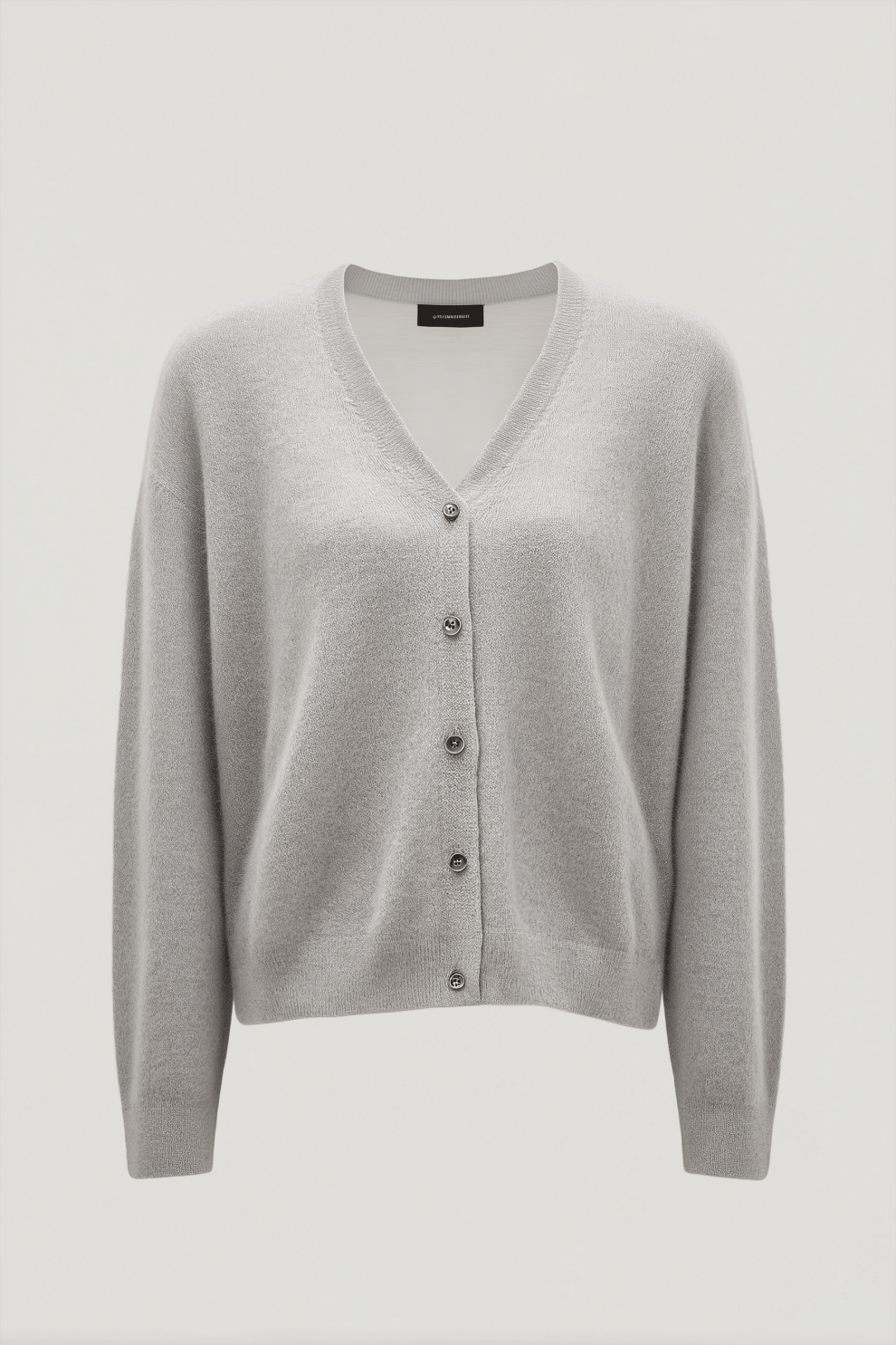 Кардиган на пуговицах из ангоры. Сохраняет природную мягкость и тепло, одновременно обеспечивая изделию гибкость и устойчивость к деформации. Прямой крой и универсальная длина делают его уместным как в повседневных, так и более собранных образах. Сдержанный дизайн завершён пуговицами из натуральной ракушки.