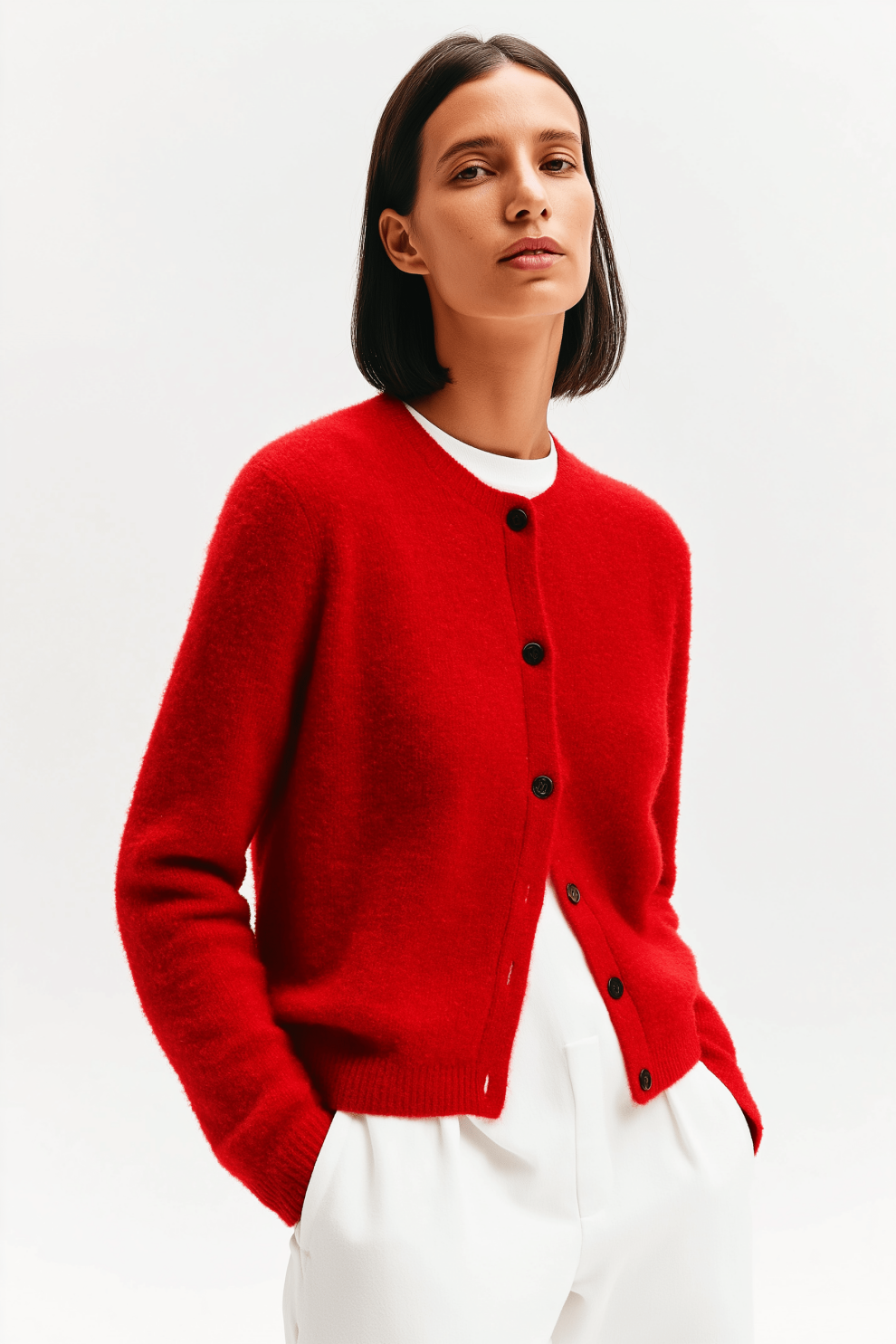 Кардиган на пуговицах из ангоры. Сохраняет природную мягкость и тепло, одновременно обеспечивая изделию гибкость и устойчивость к деформации. Прямой крой и универсальная длина делают его уместным как в повседневных, так и более собранных образах. Сдержанный дизайн завершён пуговицами из натуральной ракушки.
